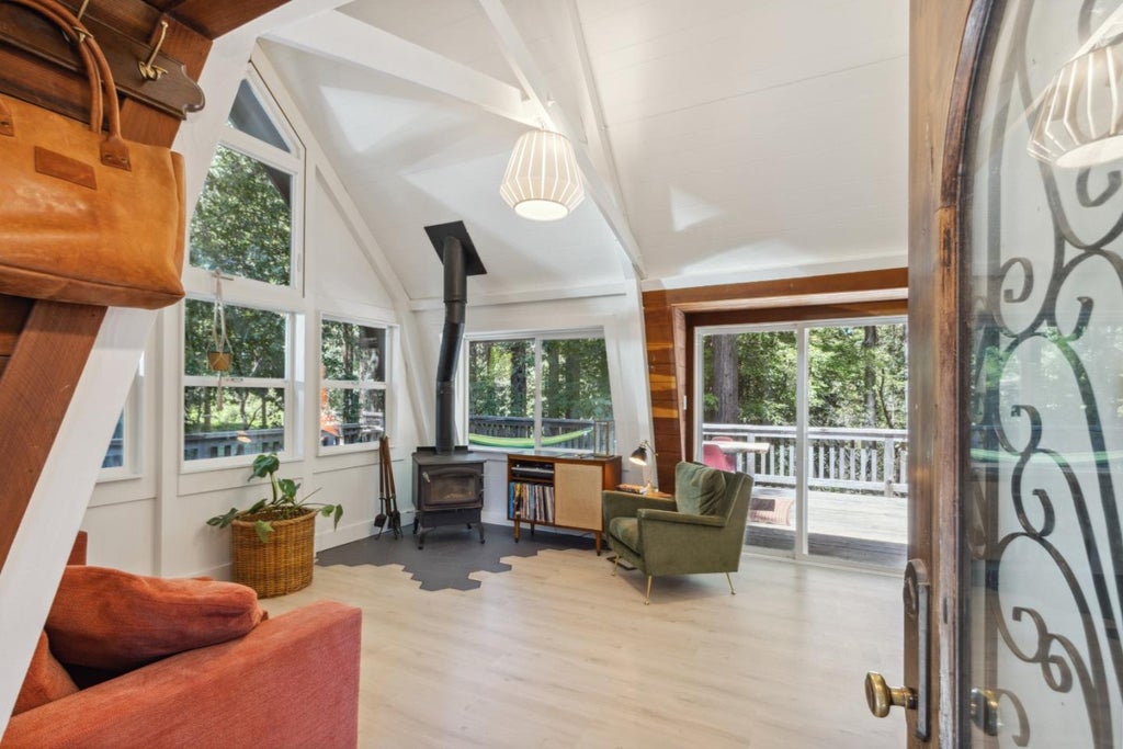 Milled and framed locally sourced timber this fully renovated A-frame retreat blends timeless charm with contemporary Scandinavian style, featuring clean lines, a minimalist palette, and natural light throughout. In the kitchen thoughtfully installed and designed custom cabinetry features pull outs and new high end appliances. In the bedroom you will find custom redwood furniture built locally and assembled in place that conveys with the home. Upstairs, a cozy loft adds flexible space perfect for a home office, yoga studio, reading nook, or playroom. Venture outside onto the expansive redwood deck ideal for summer BBQs and entertaining. The sun filled garden offers a peaceful space for gardening enthusiasts. Ample parking includes space for up to three vehicles, including room for an oversized car or camper. Enjoy a private well producing 8 gallons per minute with clean water from the heart of the mountain. You're just minutes from downtown Ben Lomond, with easy access to beloved local spots like La Placa Bakery, Aroma, and Spanky's Diner as well as shopping and top-tier hiking/ mountain biking trails and a local waterfall! Commute with ease as Silicon Valley 35 minutes away, and the beaches of Santa Cruz 20 minutes down the road. This is more than a home, its a lifestyle.