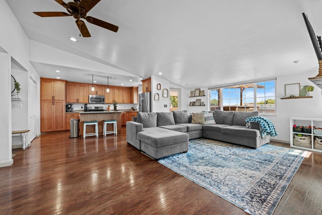 Welcome to this inviting 3 bedroom, 2.5 bathroom home offering a perfect blend of comfort and convenience just minutes from downtown. Step inside to discover beautiful laminate flooring, vaulted ceilings, and an open floor plan that creates a light and airy atmosphere throughout. The kitchen opens up to the large living room, where a cozy gas fireplace sets the scene for relaxing evenings at home. This home is equipped with ceiling fans throughout, generously sized closets, and a large sunny back deck ideal for morning coffee or entertaining guests. The backyard is a blank canvas, ready for your personal touch and landscaping dreams. With tons of storage space under the house, you'll have space for everything you need and more. Located walking distance to Vista Park Hill playground, baseball field and BBQ facilities, this home offers easy access to recreation and Highway 25, all while being just moments away from the heart of downtown Hollister. Whether you're a first-time homebuyer or a seasoned investor, this home offers a great opportunity.