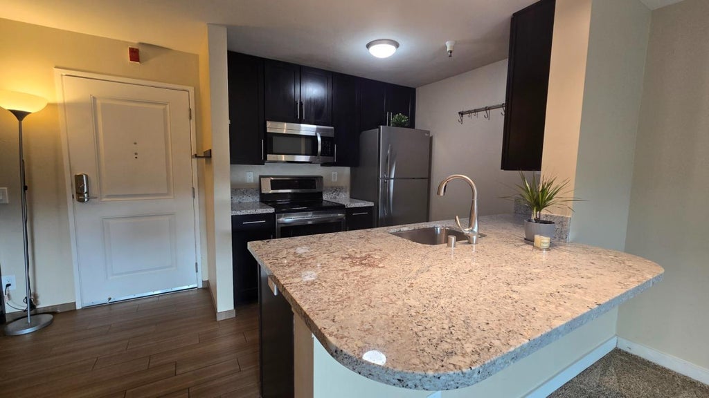 Home is now VA Approved and approved for Conventional Loans! Welcome to this charming 1-bedroom, 1-bathroom home located in the vibrant city of Emeryville. This cozy 743 sq ft residence provides a comfortable living space with a well-appointed kitchen featuring granite countertops, a dishwasher, electric oven, and refrigerator. The kitchen seamlessly flows into the family room, creating a perfect space for entertaining or relaxing. Enjoy your meals at the breakfast bar, and unwind in the living area. The bathroom offers a combined shower and tub for your convenience. The home is equipped with central forced air heating and in-unit laundry with a washer and dryer. This community boasts fantastic amenities, including an in-ground pool, spa/hot tub, and a cabana/dressing room for those sunny days. Additionally, the property includes one fully covered gated garage space, large BBQ area with many tables, huge community room, additional quiet/study room. The large modern gym comes with a sauna and massage room. A live host is available to accept package deliveries. Close to biking trails, Bay Bridge, dog park, playground and walking distance Emeryville Market with some of the best restaurants in the area. Make this delightful Emeryville residence your new home!