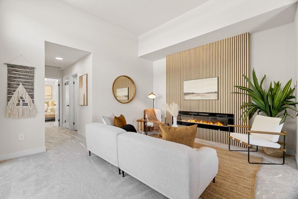 Steps to Townsend Parks walkability, courts, swing sets, playgrounds, and open green, this vaulted 2-bed and 1-bath condo lives bright and modern with soaring ceilings across the great room and kitchen. Whole-home upgrades include a fresh low-VOC paint refresh in a designer palette, all-new baseboards and trim, uniform LED lighting with sleek fixtures, updated white switches and tamper-resistant outlets with GFCIs where required, and plush newly installed carpet. The kitchen shines with quartz countertops and matching backsplash, professionally repainted cabinetry, a durable waterproof floor with clean transitions, caulked seams, and toe-kick molding. The permitted bath remodel adds a contemporary vanity with integrated sink, framed mirror and designer light, coordinated brushed gold hardware, a water-efficient modern toilet, moisture-resistant luxury vinyl flooring, and high end paint. Laundry washer and dryer have their own dedicated room inside. The living room is anchored by a custom feature wall with acoustic friendly wood-slat detailing and a built-in electric fireplace pre-wired for media. Ground-level private one-car garage, number 112. Enjoy easy access to 101/880, SJC, and the North First tech corridor. Swing by Saturday or Sunday for open houses to see the newness.
