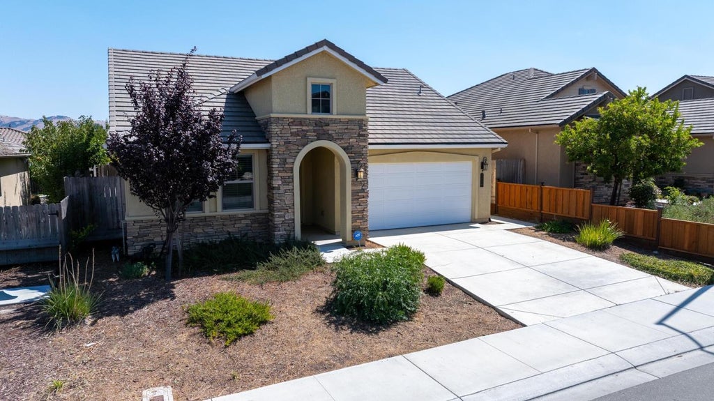 Back on the market at no fault to seller! Welcome to the beautifully maintained 3-bedroom, 2-bathroom home in the desirable Santana Ranch community of Hollister. Open-concept living and dining areas with tile flooring and abundant natural light. The kitchen features granite countertops, Bosch stainless steel appliances, a large island, and soft-close cabinetry. Spacious primary suite offers a walk-in closet and private ensuite. Two additional bedrooms and a second full bathroom provide comfort for family or guests. Enjoy outdoor living on a large backyard patio with an arbor. Other highlights include central A/C, ceiling fans, double-pane windows, and a 2-car garage. Located at the end of a cul-de-sac for added privacy, close to parks, shopping, and schools. Move-in ready and perfect for modern living.