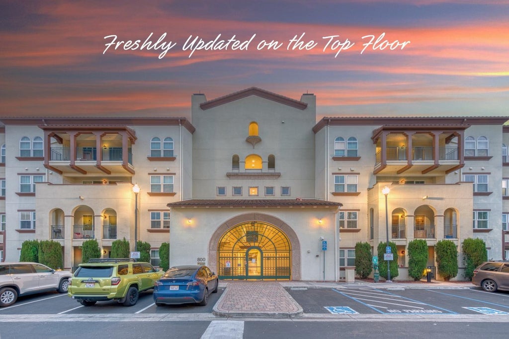 Introducing this exceptional 2-bed, 2-bath, 1,259-square-foot, single-level condo on the top (5th) floor of the meticulously cared-for Terra Serena Luna gated complex. This unit offers a tranquil courtyard-facing location and features an east-facing balcony. The open floor plan includes a spacious living and dining area, creating a perfect setting for comfortable living. The master bedroom serves as a luxurious retreat with its walk-in closet, double vanity, oversized soaking tub, and separate shower stall. This condo is packed with premium features: new top-quality SPC flooring, new kitchen sink & faucet, new carpet, fresh paint, new kitchen appliances, new ceiling fans, new recessed lights, and new light fixtures throughout. You'll also appreciate the convenience of an in-unit laundry room and central A/C and heating, along with two side-by-side parking spaces conveniently located next to the elevator. The complex has recently added EV chargers, providing a convenient and eco-friendly amenity for residents. It also offers a clubhouse, gym, swimming pool, jacuzzi, BBQ area, playground, courtyard, and elevators. HOA dues cover water, garbage, and insurance. The property is within walking distance of the Great Mall and light rail. Some photos have been virtually staged.